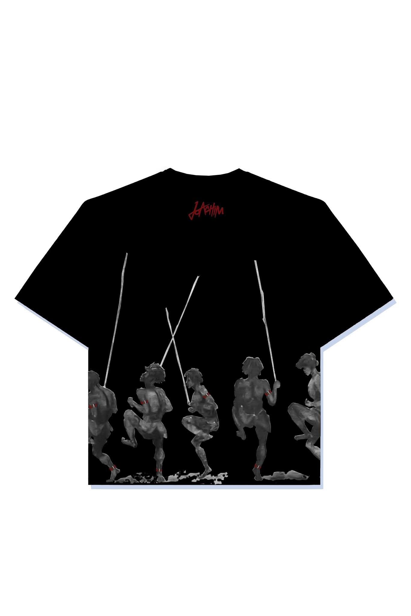 Set against deep matte cotton, the artwork wraps almost as a panoramic sequence. Each figure sculpted in grayscale with deliberate red accents — a heartbeat on fabric, marking joints, weapons, and motion. It’s almost cinematic, almost still — somewhere between tradition and sculpture.